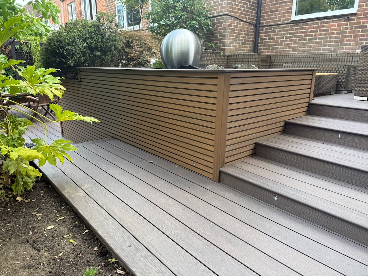 The garden looks totally transformed. We installed a large composite deck using top-quality products from @envirobuild —and even the frame is composite, so it’s built to last for years to come. The planters were rebuilt and wrapped in slatted composite cladding, with a matching facing board from the decking along the top to tie everything together beautifully. We then finished it all off with LED spotlights around the deck for the perfect evening glow. Sleek, sustainable, and low-maintenance—ready for endless outdoor moments.
